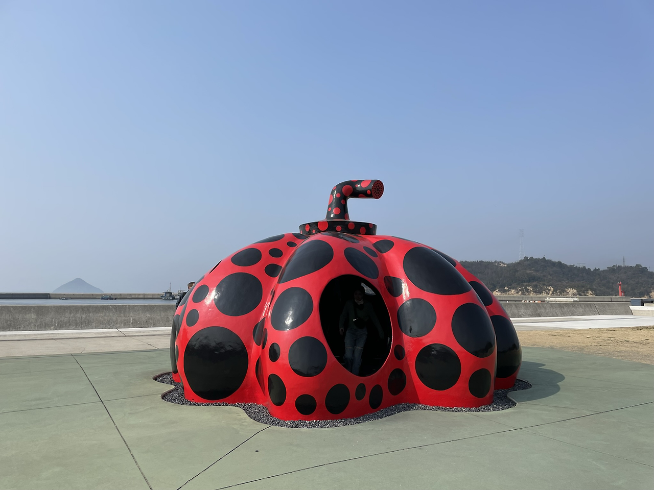 배에서 내리자마자 여기는 그 누구도 이의를 제기할 수 없는 예술의 섬이야! 라고 말해주 듯, 쿠사마 야요이의 빨간호박이 푸른 바다를 뒤로 하고 내 시야에 나타난다. 멀리서 봐도 그 존재감이 얼마나 크던지 모든 사람의 발걸음이 저절로 그 쪽을 향하게 한다. 먼저 도착한 사람들이 빨간 호박의 안과 밖에서 사진들을 찍느라 분주하다. 나오시마의 호박중 빨간 호박은 안으로 들어갈 수 있게 되어 있기 때문이다. 나도 '오늘도 기분이 좋다'는 표시로 손을 흔들며 셀프로 사진을 한 컷 찍고는 나오시마의 골목을 탐방을 시작했다.