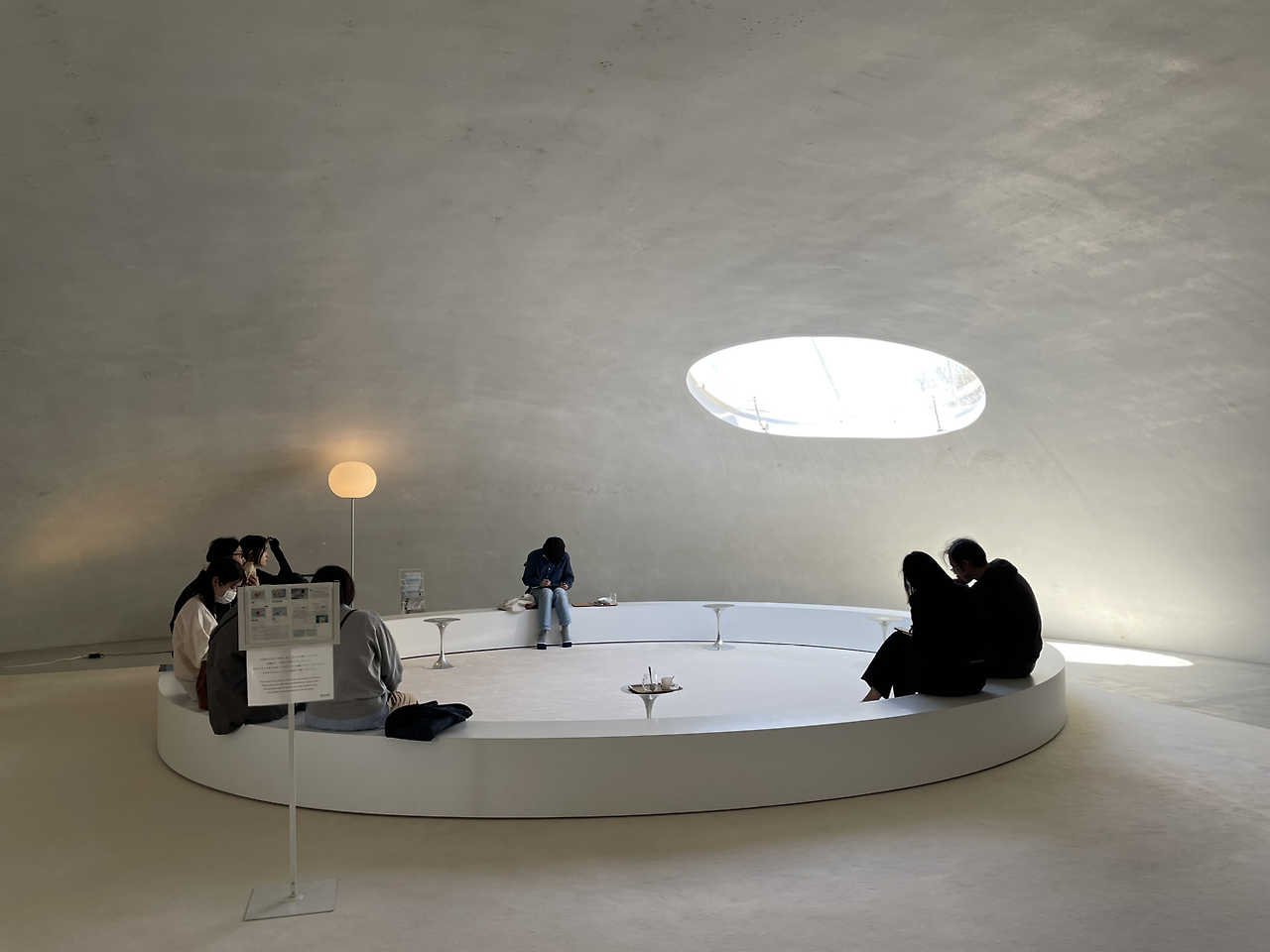 야외에 길게 펼쳐진 길을 따라 섬을 한 바퀴 돌 듯 쭉 돌아서 간다. 기막힌 자연의 풍경을 가장 먼저 만나게 하는 이 방식, 신선하다. 그렇게 한참을 걸어가다 보니 드디어 커다란 하얀색의 돔 같은 건물이 보인다. 그것이 바로 테시마 아트 뮤지엄이다. 여기도 역시 안내직원이 서있다. 몇 사람을 모아 두고 관람 시 주의 사항을 알려준다. “소리 내지 말기, 말하지 말기, 사진 촬영 안되고 바닥에 있는 물이나 구슬에 손대지 말기” 같은 주의사항을 언어로도 문자자료로도 단단히 알려준다.