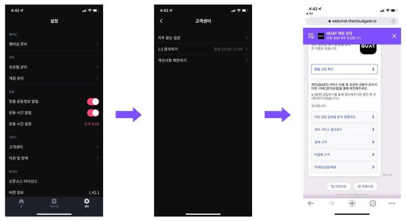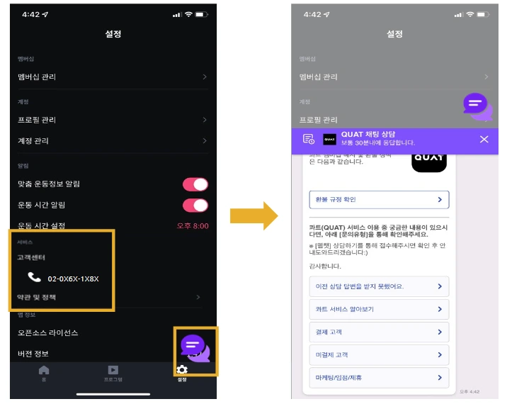 현재 콰트와 관련한 문의 사항이 생기면 앱 내 1:1 고객센터를 이용해야만 한다. 1:1 문의를 진행하기 위해서는 '홈 화면의 '설정' → 고객센터 → 1:1 문의하기 → 외부 '웹챗' 문의 진행'의 4단계를 거쳐야 한다.