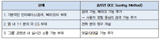 ** '3. '그룹' 콘텐츠 내 실시간 소통 기능 부재'의 경우, 고객의 불편보다는 건의에 가까운 항목이었다. 즉, 문제점 해결보다 새로운 기능 추가에 더 적합한 항목이며 모든 고객들이 사용하는 기능은 아니기 때문에 이번 MVP는 해당 항목을 제외한 2가지 문제에 초점을 맞추고 기획하고자 한다.