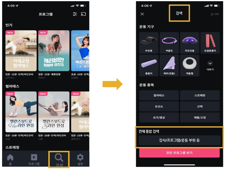 그리고 기존의 '필터' 화면을 검색 기능으로 가져온 후에 전체 통합 검색 창을 추가하였다. 강사 이름, 프로그램 제목, 운동 부위 등 찾고자 하는 검색어를 넣으면 키워드 일치 검색 결과를 보여 주는 기능이다.