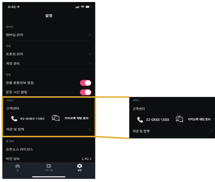 가장 신속하고 직접적인 CS 응대는 전화라고 생각한다. 따라서 '설정' 화면에서 바로 연결할 수 있도록 고객센터 번호를 추가하였다.