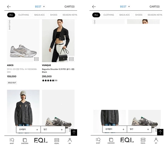 EQL은 패션 관련 상품을 판매하는 커머스 앱이다. 따라서 무신사, 29CM 등과 같은 여느 패션 커머스 앱들과 유사한 UX를 제공하고 있다.