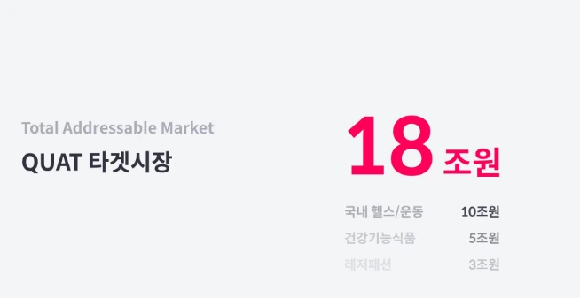 현재 콰트는 '젝시믹스', '랭킹닭컴', '칼로바이', '프로틴방앗간' 등의 기업들과 제휴하며 에슬레저 패션과 건강기능식품 등 운동과 관련한 모든 콘텐츠를 제공하고자 노력하고 있다. 또한 네이버 스토어를 통해 자체적으로 홈 피트니스에 필요한 운동 기구도 판매하고 있으며, 이는 헬스케어/건강기능식품/에슬레저 패션 시장 규모, 즉 콰트의 타겟 시장 규모가 보장되어있음에 따라 전략을 세운 것으로 보인다.