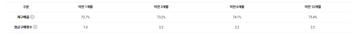 위는 엔라이즈 프로덕트 전체(위피, 콰트)의 재구매율을 나타낸 표다. 참고용으로 첨부했으며 12개월 전에 비해 지속적으로 감소하고 있지만 계속 70%대를 유지하고 있기 때문에 무조건 부정적으로만은 볼 수 없고, 콰트만의 데이터가 아니기 때문에 분석하기에 한계가 있다.
