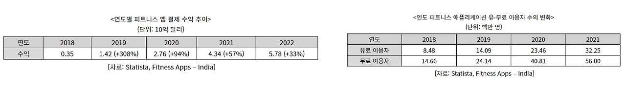 시장 리서치기관 EMIS의 자료에 따르면, 인도의 피트니스 시장은 2026년에 2021년 규모보다 50% 성장한 9억 달러에 달할 것으로 전망된다. 인도는 코로나19의 타격을 가장 심하게 받은 국가로, 육체적/정신적 건강에 대한 갈망이 큰 상태다.