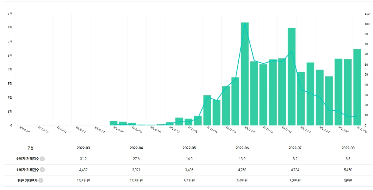 그러나 최근 데이터를 보면 긍정적으로만은 볼 수 없다. 위의 왼쪽 그래프는 엔라이즈의 소비자 거래지수 및 평균 거래단가를 나타낸 표다. 콰트만 따로 볼 수 있었으면 좋았겠지만 불가능하여 엔라이즈 전체의 통계를 가져왔다. 최근 3개월 동안 소비자 거래건수는 증가했으나 소비자 거래지수는 감소하였다. 물론 왼쪽 그래프가 콰트만의 통계가 아니기 때문에 확실한 분석은 불가능하다.