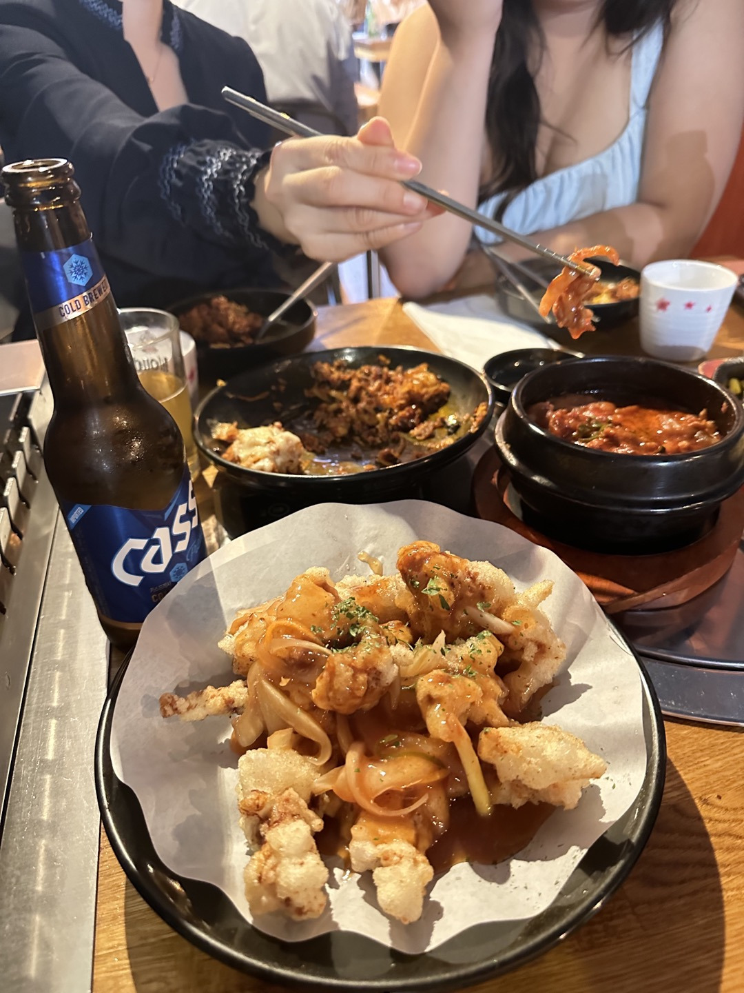 한국에서 먹는 머리가 쭈뼛 서는 매운 닭발 맛이다. 맵찔이라 정신을 못차릴 즈음에 콘치즈를 먹으면 닭발을 한 개 더 먹을 수 있는 용기를 불어넣어준다. 닭갈비 치즈 볶음밥과 꿔바로우도 같이 시켰는데 달고짜고매운 조합에 친구들과 너무 감탄하면서 먹었다.
