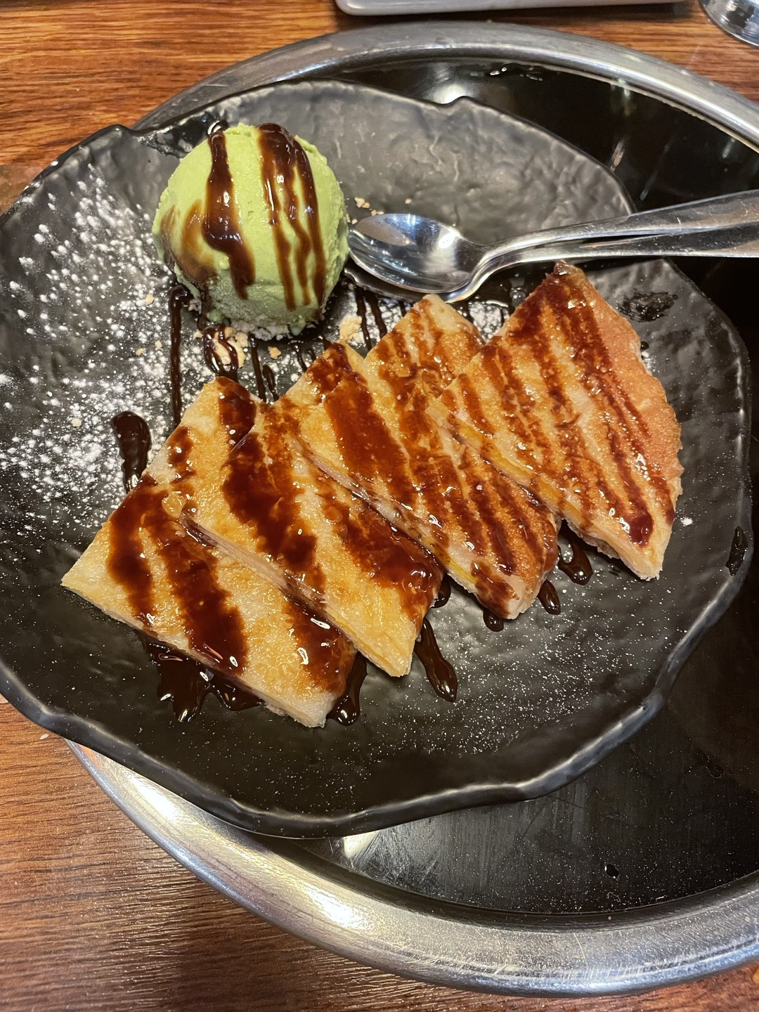 1층 분위기는 굉장히 모던하다. BBQ를 다 먹고 난 후에 디저트 메뉴도 준비되어 있는데, 개인적으로 호떡을 너무 맛있게 먹었다. 호떡을 4개로 잘 짤라주신 후에 녹차 아이스크림과 호떡 안에 들어가는 설탕 소스를 뿌려주신다. 친구들이 너무 좋아해줘서 정말 뿌듯했던 디저트 초이스였다.