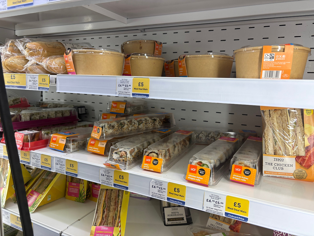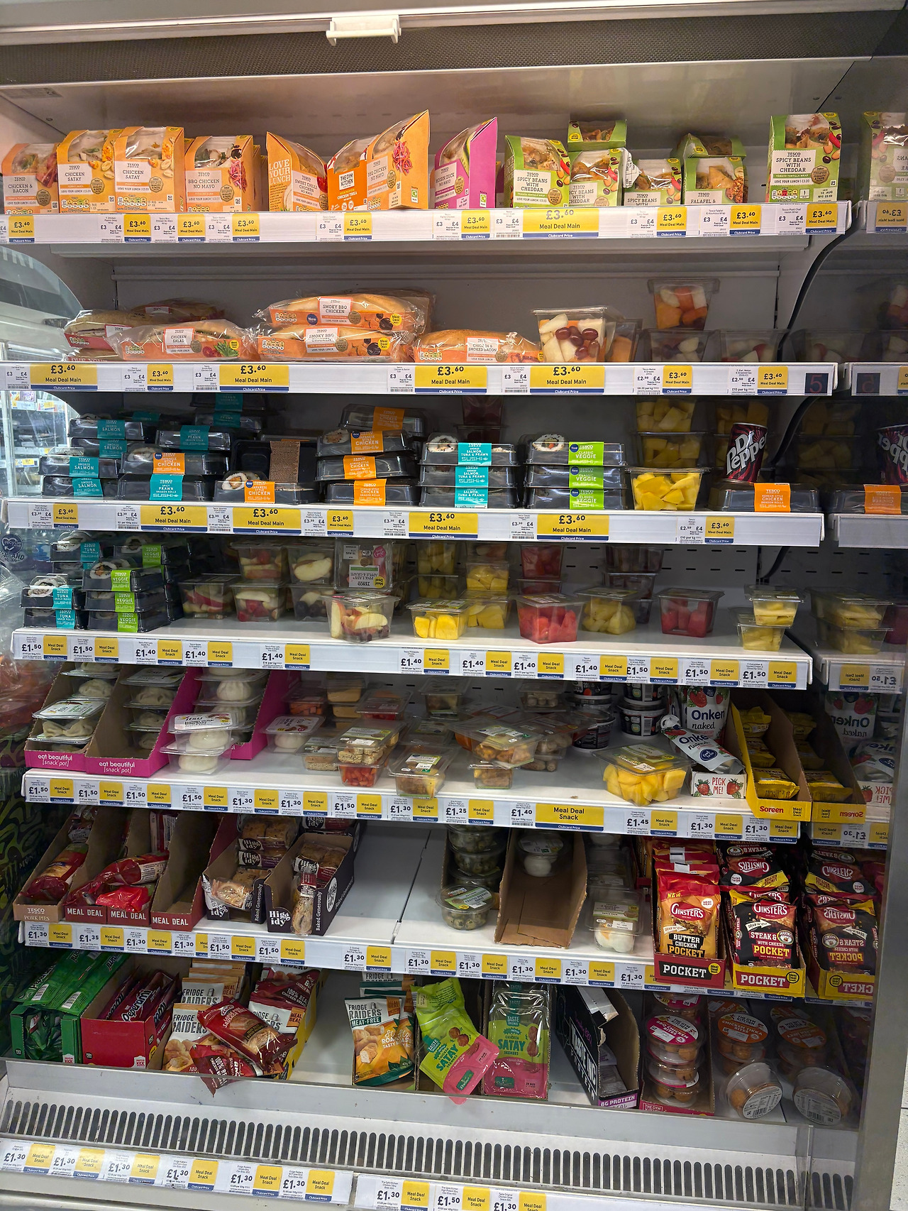 (1) 메인 (샌드위치, 랩, 샐러드, 스시 롤 등) + (2) 스낵 (과일 컵, 요거트, 디저트, 감자칩(...)) + (3) 음료 (탄산수, 커피, 코코넛 워터, 프로틴 쉐이크) 를 골라서 세트 가격에 산다. Tesco는 회원카드를 찍으면 3.6파운드에 살 수 있다. 약 6,500원 정도 하는 셈이니 한국 여의도 점심가격보다 싸다.
