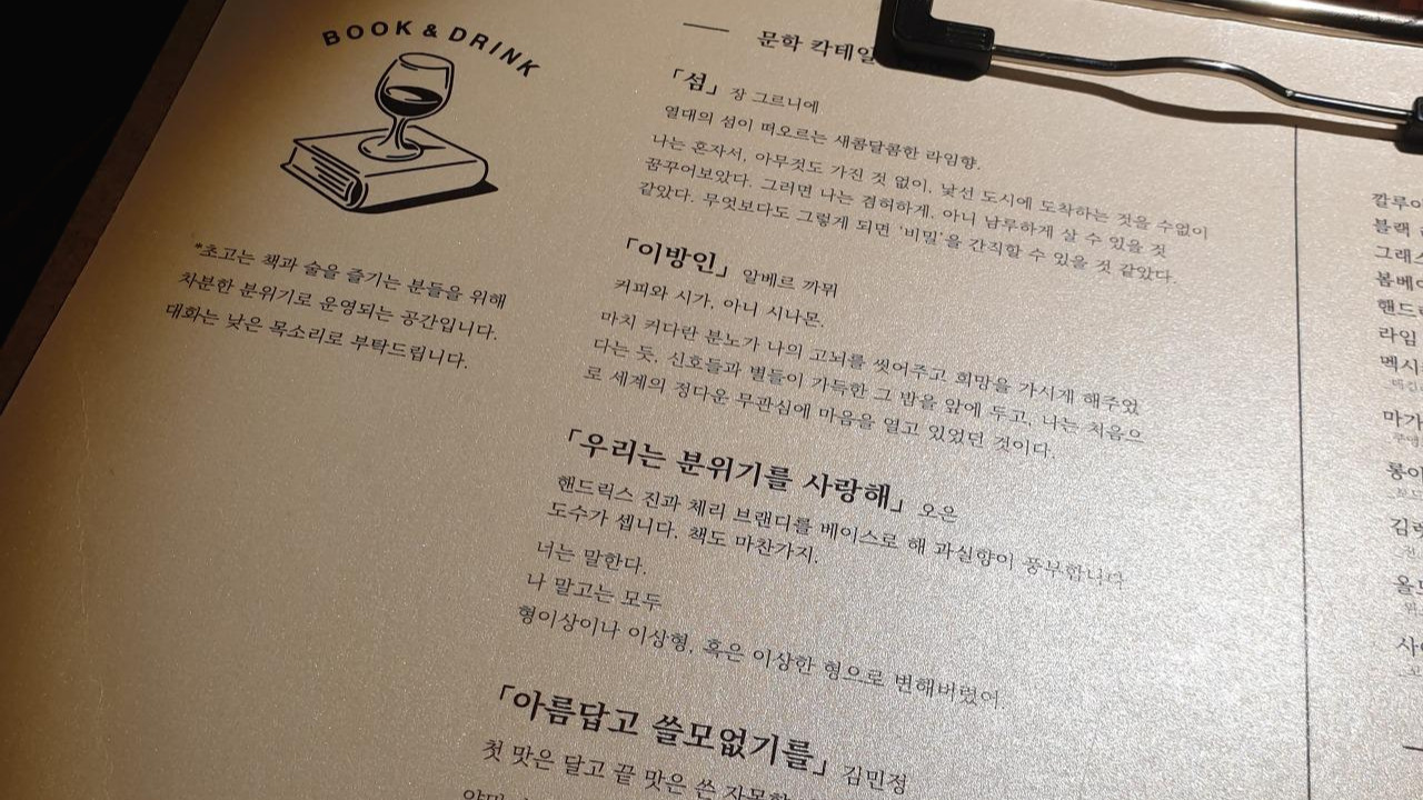 겨우 도착한 “초고”는 커피보다 위스키가 더 어울리는 것 같은 공간이었다. 서두르느라 올라간 체온을 내리기 위해 겉옷을 벗으면서 메뉴판을 훑어봤다. 이곳에서만 파는 칵테일이 있는 것 같았다. “문학살롱”이라는 이름답게 칵테일에는 작품의 이름이 하나씩 붙어있었다. 그중에서 내 눈길을 사로잡은 것은 알베르 카뮈의 《이방인》이었다.