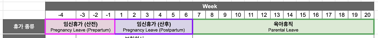 임신휴가(산후): 실제 출산일로부터 자연분만은 6주, 제왕절개는 8주까지 쓸 수 있다.
