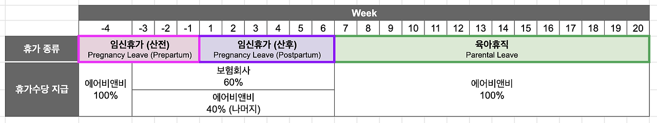에어비앤비의 출산휴가는 임신휴가(Pregnancy Leave) 산전 4주 + 산후 6주 (제왕절개는 8주), 그리고 육아휴직(Parental Leave or Bonding Leave) 14주를 합쳐 최대 24주(제왕절개는 26주)이다.