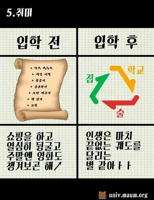 낙'樂'은 고등학생 때에도, 대학생 때에도, 그 이후에도 없어선 안 되는 것이다. 특히 성인이 되고, 온갖 특이한 취미생활을 가진 사람들이 모여있는 대학은 새로운 취미를 찾기 위한 최적의 장소다. 대학에 갔다면 술도 좋지만, 술 말고 나만의 새로운 재미를 찾아보자. 그 길을 쉽게 열어주는 것이 바로 동아리다.