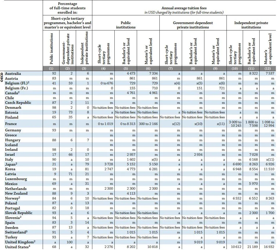 OECD 국가별 대학등록금 자료 원본. 출처 : OECD 2016 Education at a Glance