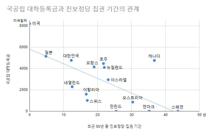 진보정당이 오래 집권할수록 대학등록금은 싸지고, 보수정당이 오래 집권할수록 대학등록금은 비싸진다. 노회찬 의원이야 진보정당의 필요성을 말하기 위해 이 연관성을 언급했지만, 사실 똑같은 데이터로 보수정당의 필요성을 이야기할 수도 있다. '교육의 질,' '대학 교육에 대한 국가 개입(세금 투입) 배제' 등 학비는 온전히 개인이 부담해야 하는 것이라고 주장할 논리도 분명 존재한다.