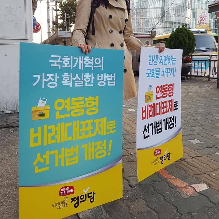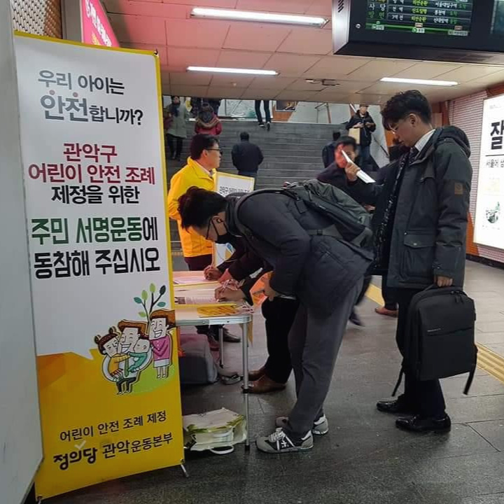 (왼쪽) 신촌에서 열린 입당 캠페인, (가운데) 전국적으로 진행한 선거법 개정 캠페인, (오른쪽) 정의당 관악구 지역위원회에서 진행한 [어린이 안전 조례] 제정 서명 운동
