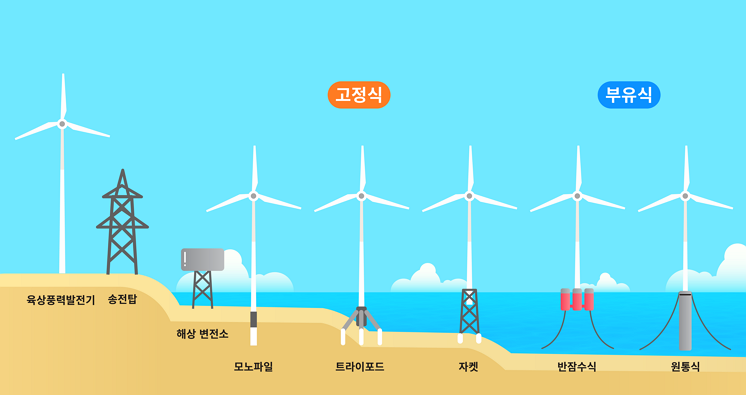 그중 고정식 해상풍력을 예로 들겠습니다. 해상풍력은 하드웨어 측면에서 밑받침인 1) 하부구조물, 지지대인 2) 타워, 바람을 에너지원으로 받아들이는 3) 블레이드, 이 블레이드의 힘을 에너지원으로 저장하는 전장 구조인 4) 풍력터빈(혹은 나셀)으로 나눌 수 있습니다.