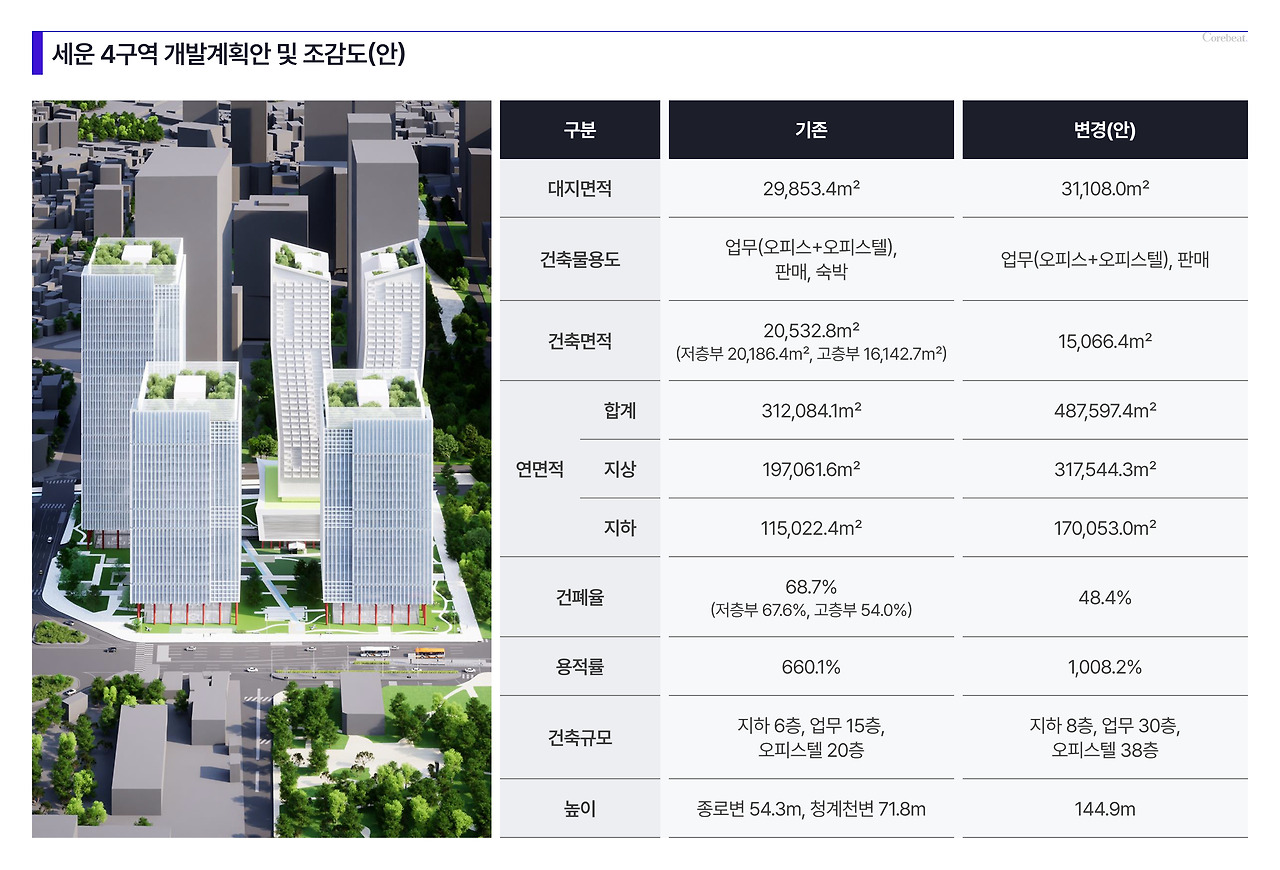 그런데 새로운 계획은 용적률을 1,008%로 높이면서 건폐율은 오히려 20%p나 낮춘 48.4%로 계획했다. 오세훈 시장이 2023년 발표한 <녹지생태도심 재창조 전략>에 따라 개방형 녹지를 늘려 용적률 혜택을 받기 위함이었다. 용적률은 늘었는데 바닥 면적(건폐율)이 줄어드니 당연히 건물이 위로 솟구칠 수밖에 없다.
