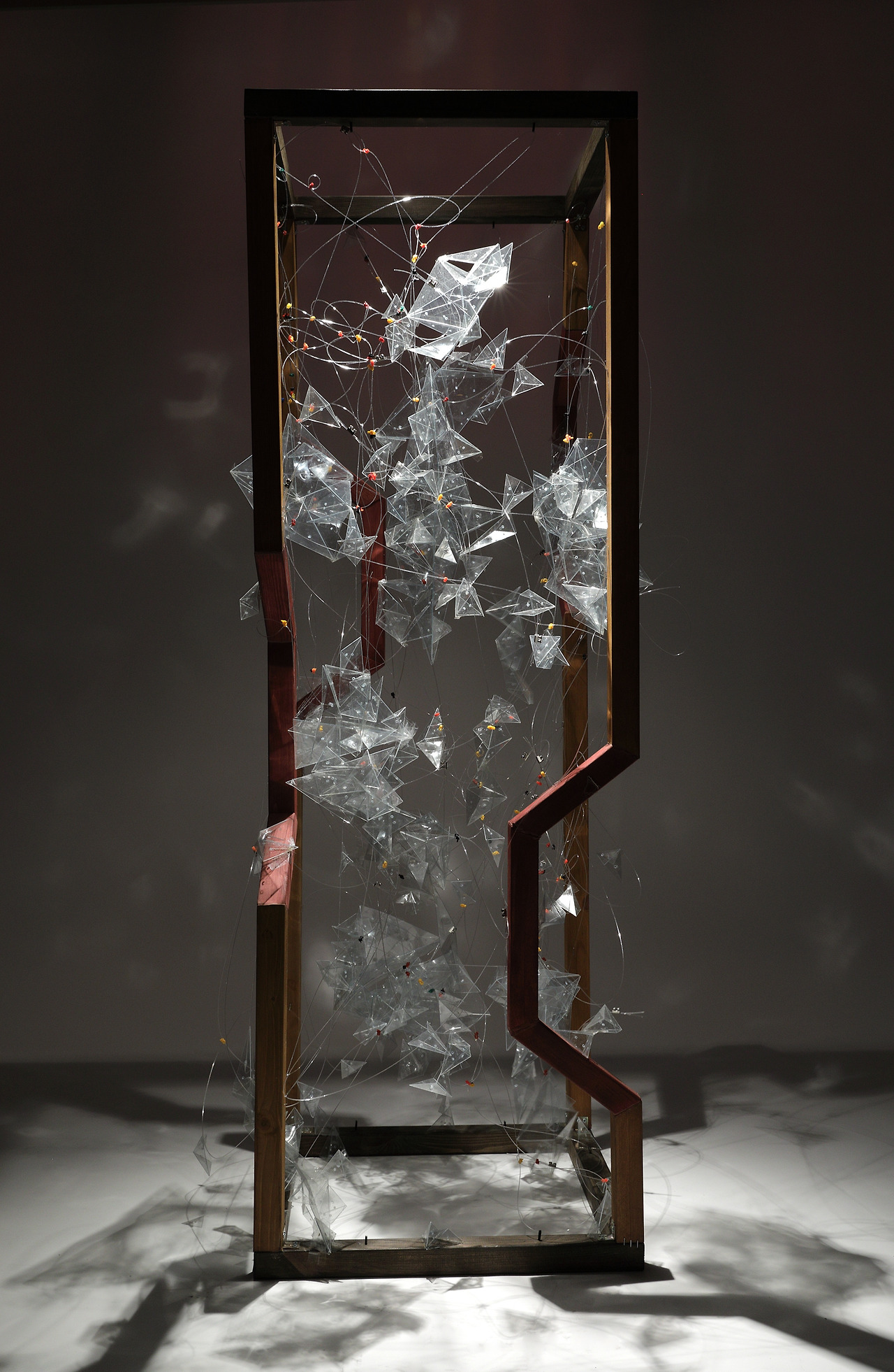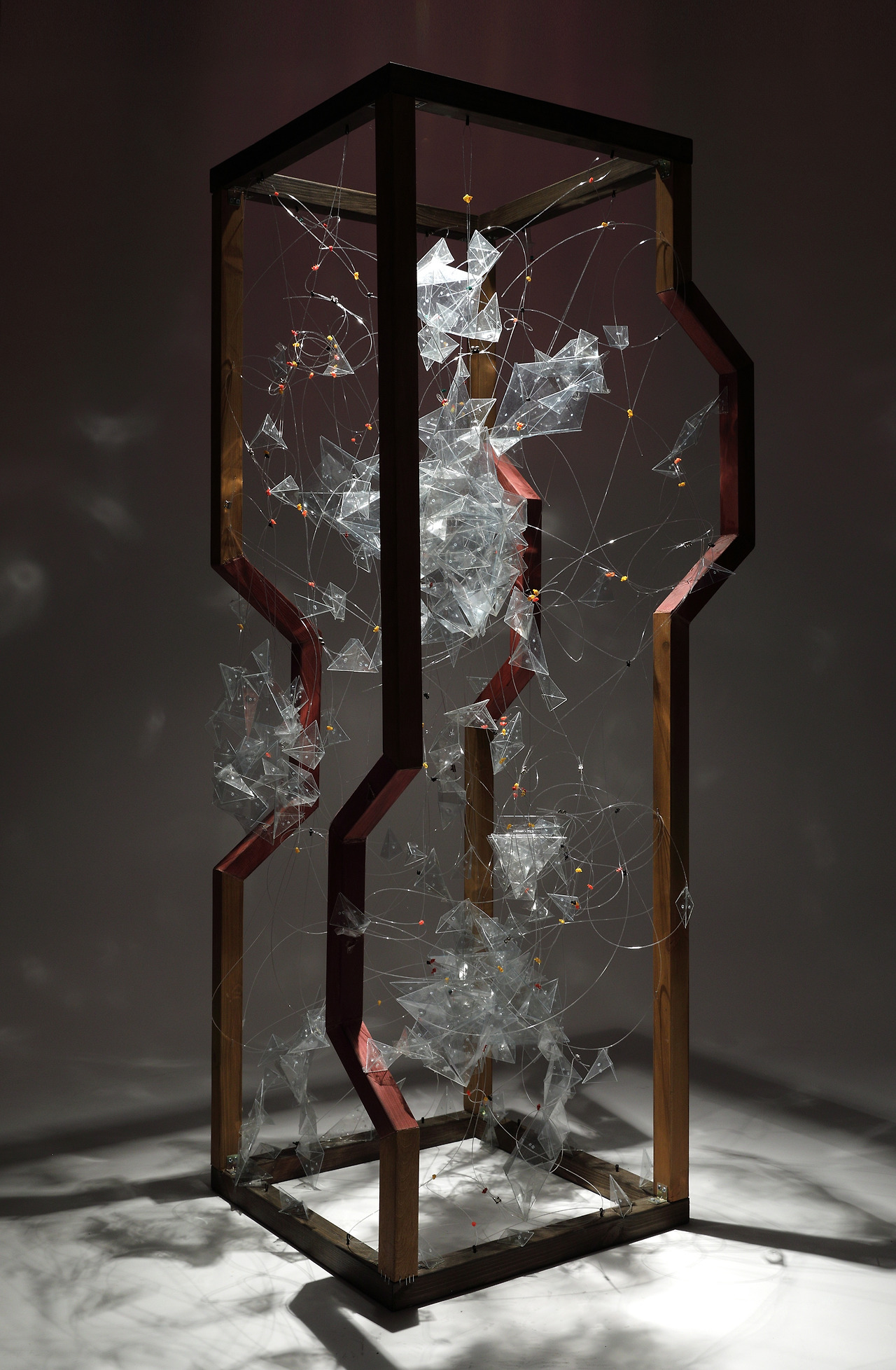 나는 나 자신을 나무 프레임으로 형상화하고, 그 안에 가치들을 상징하는 작은 크리스털을 광섬유로 연결했다. 나무 프레임은 전통과 자연의 견고함을, 광섬유로 연결된 크리스털은 놀이와 기억처럼 유동적인 가치를 표현했다. 전체는 뇌 속 뉴런처럼 보이도록 디자인되었고, 나의 건축적 사고가 유기적으로 연결되어 있음을 시각화했다.