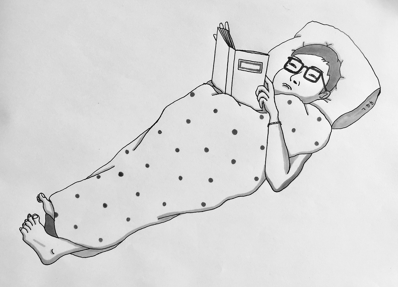남편이 퇴근을 하고 집에 오면 저녁 여섯 시 쯤 된다. 우리는 함께 저녁 밥을 지어먹고 뒷정리를 한다. 그 후에는 계속 식탁에 앉아 수다를 떨거나, 예능, 유튜브 등을 보면서 함께 낄낄댄다. 아침 잠에 비해 밤 잠이 많은 남편은, 아홉 시가 넘어가기 시작하면 이제 그만 잘 준비를 해야겠다며 방으로 들어간다. 그의 '잘 준비'는 침대에 누워서 휴대폰을 보거나 책을 읽는 것이다. 보통 한 시간에서 길게는 (내가 계속 말을 걸며 잠들기를 방해하면) 두세 시간 정도 걸린다.