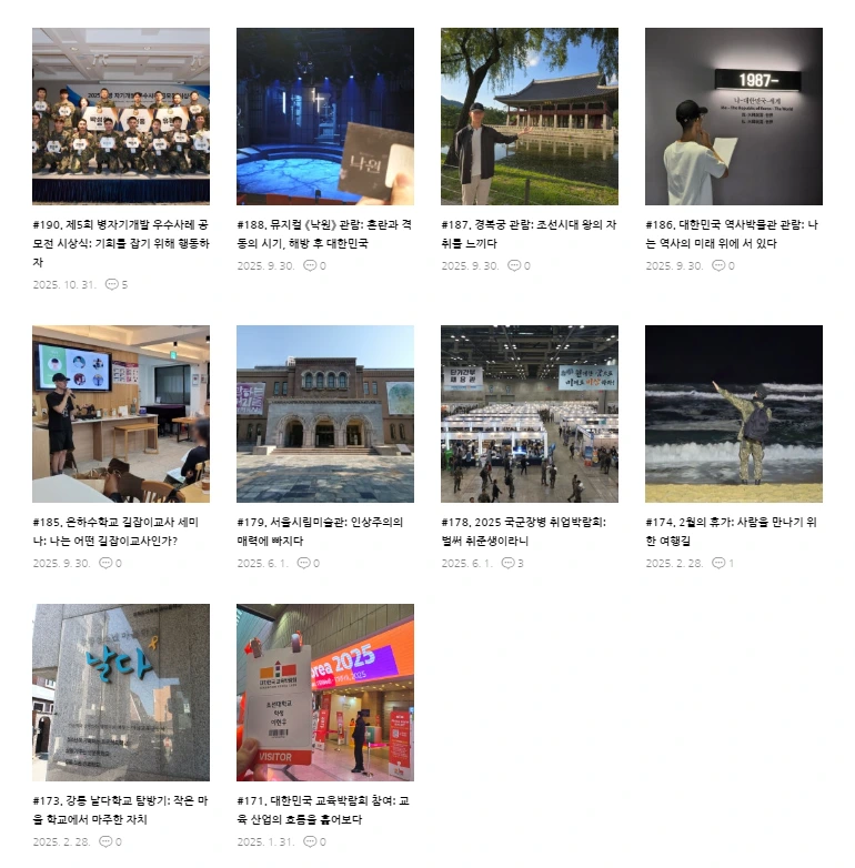 휴가를 나올 때마다 나는 ‘휴가 일기’를 썼다. 단순한 여행기가 아니라 경험 아카이브였다. 멘토 인터뷰, 교육기관 방문, 미술관 관람, 서점 탐방 같은 활동을 기록했다. 그 내용을 브런치 블로그에 옮기자, 글은 더 이상 ‘나만의 기록’이 아니었다. 비슷한 고민을 가진 사람들과 연결되었다.