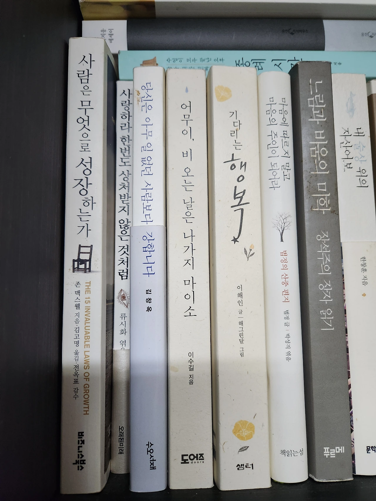 그러니 큰일이 다가와서 주저앉게 되더라도 마냥 슬퍼해하지 말기를. 자기에게 다가오는 메시지에 힘입어 살아보자. 큰 고비를 넘고 나면 부엌 옆 책장에 꽂힌 책 제목이 떠오른다. 엄마가 모은 책들 사이,