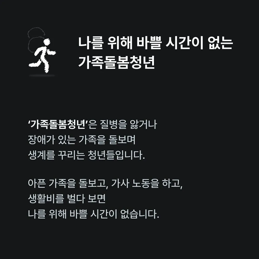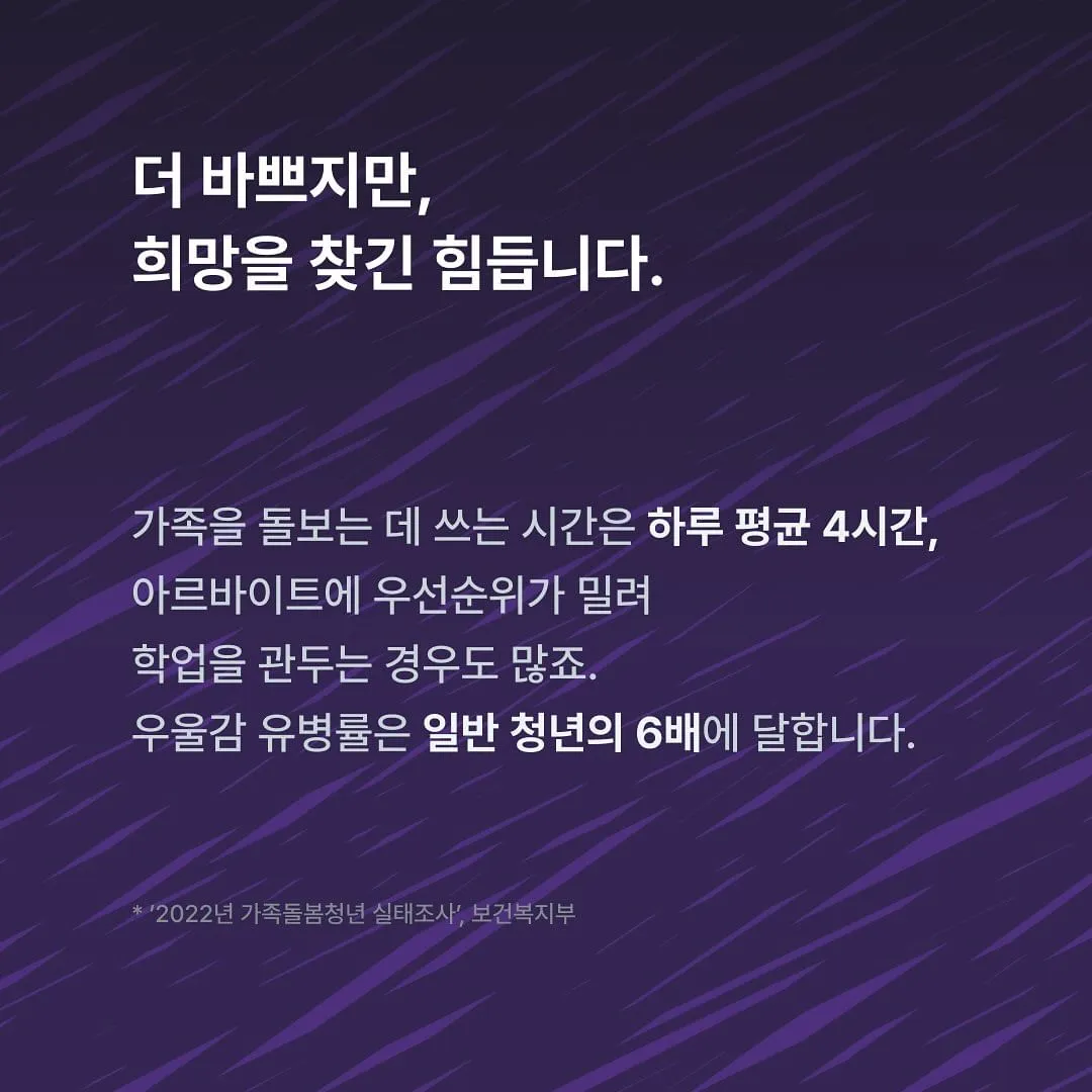 하지만 모두가 그런 상황은 아니에요. 가족의 생계를 혼자 책임지면서, 돌봄도 계속 도맡아야 하는 가족돌봄청년들도 있거든요. 그러니까 돈도 벌고, 공부도 하고, 돌봄도 하고. 자신을 돌볼 겨를 없이 가족들에게 더 많은 시간을 쏟는, 그런 친구들이 정말 있어요.