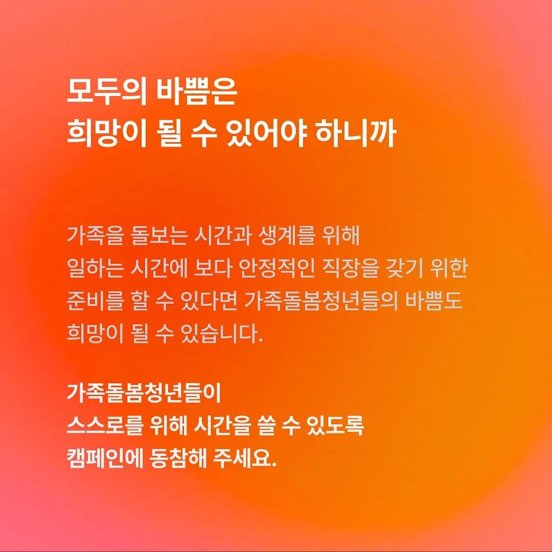 이번 캠페인에 참여하고 가족돌봄청년들에게 힘이 되어 주세요. 기부금 전액은 돌봄 서비스 비용, 생계비, 미래 준비를 위한 교육비 등으로 사용된다고 합니다.