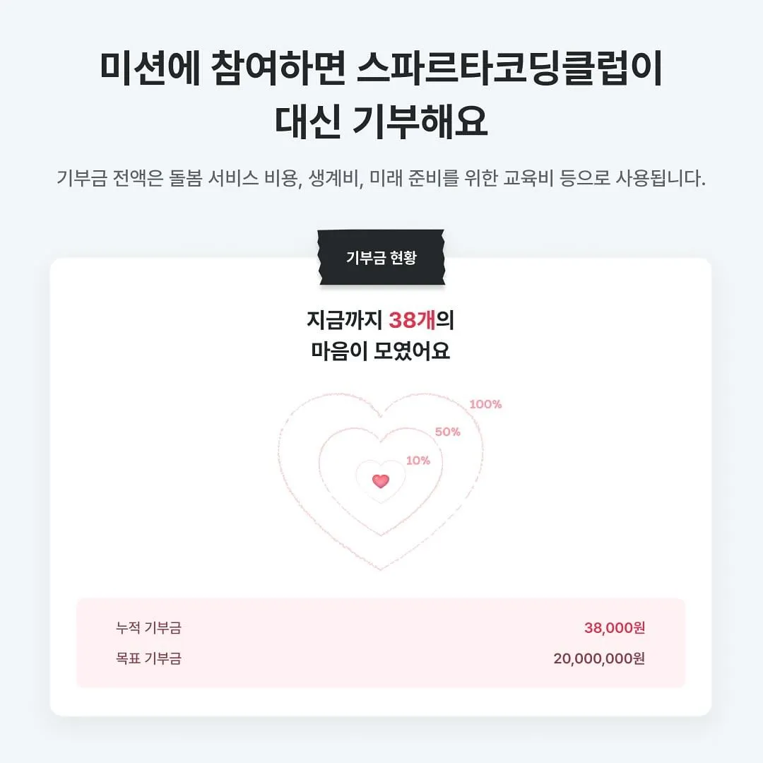 방법은 아주 간단해요! 스파르타코딩클럽에 가입하고, 아래 링크에 들어가 '마음 보내기' 버튼을 누르기만 하면 됩니다. 기부는 스파르타코딩클럽이 대신해요!