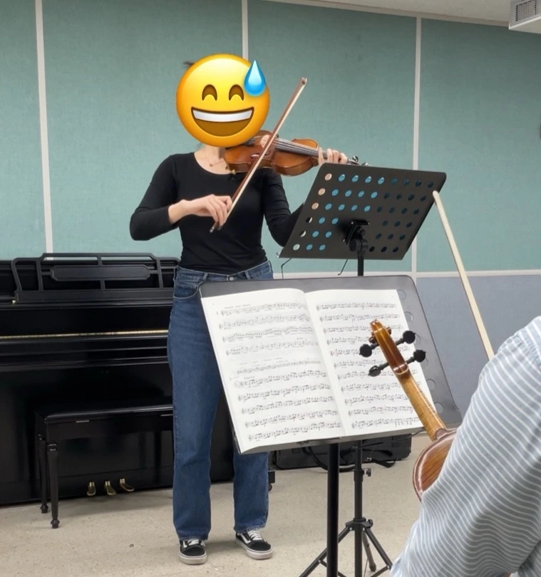 교수님이 다음 주 중간고사를 위해 리허설을 해주셨는데, 같은 수업을 듣는 학생들과 교수님 앞에 나가서 에튀드(연습곡)를 연주하는 방식이었다. 아무리 수업을 같이 듣고 내가 바이올린 켜는 걸 이미 보았다 해도 합주식 수업이기 때문에 나만 연주했던 적은 없다. 그런데 다들 내 연주만을 집중해서 보는 거니 다른 악기 소리들 속에 숨을 수가 없는 것이다. 으악