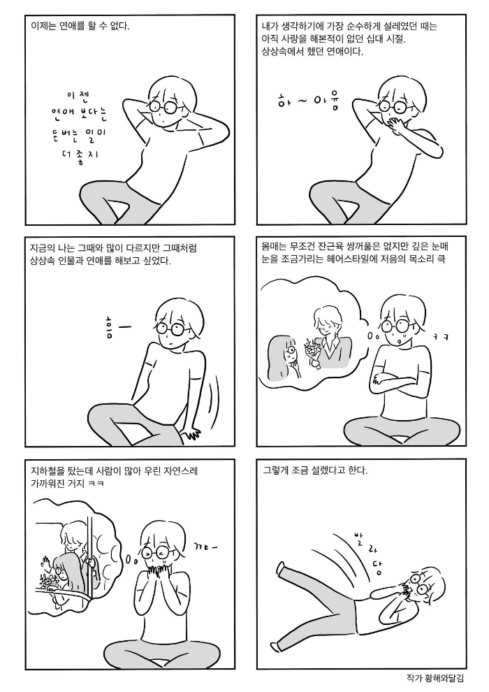 나는 갑자기 몇십 년 전인 십 대의 나로 돌아가 콩닥콩닥 설레었던 그때의 감정을 다시 느껴보고 싶었다. 그러나 그때 느끼던 감정을 다시 느끼는 건 쉽지 않았다. 몇 번의 시도 끝에 인물들이 완성되었고 그렇게 하이틴 소설을 머릿속으로 하나 쓰고 나니 조금 설레기도 하고 재미도 있었다. 그리고 생각했다. 그때! 십 대 때! 상상만 하지 말고 진짜로 소설책이라도 한편 써 볼걸 말이다. 만약 그때 진짜로 소설을 썼더라면 그래서 그걸 지금 읽었더라면 너무 웃겼을 것 같긴 하지만... 엄청 설레었을 것도 같다.