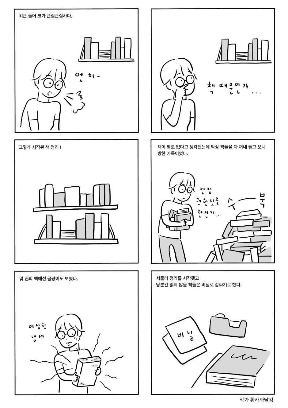 그러다 보니 꽤 오랜 시간 책을 그냥 방치했는데 어느 날 에어컨 바람에 날리는 작은 먼지를 발견했고 곧이어 코가 근질근질거리더니 재채기가 나왔다.