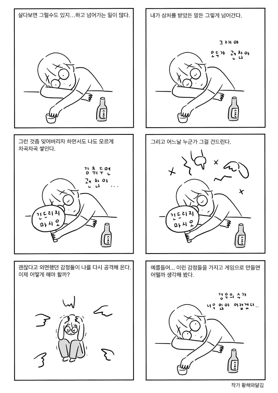 나는 가끔 엉뚱한 감정이 튀어나올 때면 이감정이 왜 나온 건지 곰곰이 생각해 본다. 과거의 어느 날 받았던 상처와 말하지 못해서 억울했던 순간들을 떠올리며 그때 해야 했던 말과 하고 싶은 말을 뒤늦게라도 한다. 종이에 막 쓰다가 찢어 버리기도 하고 혼자서 말하기도 하고 혼자가 아닐 땐 핸드폰 메모장에라도 쓴다.