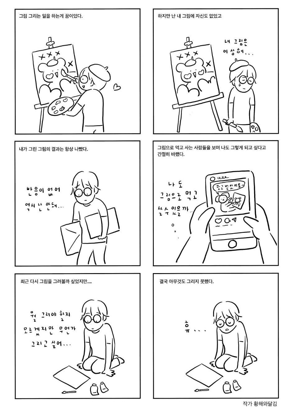그러나 현실적으로 가능한 일을 하라는 아빠의 걱정, 비싼 미술용품 가격, 비싼 미술 학원비에 꿈은 꿈이고 돈 벌 생각부터 해야 한다는 걸 깨닫게 되었다. 그러자 그림 그리며 살고 싶다는 꿈과 희망은 썰물처럼 스르르 빠져나가버렸다.