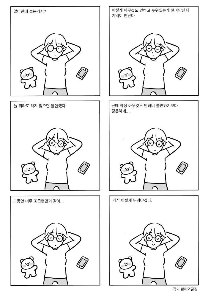 최근 들어선 아무것도 하지 않고 그냥 누워 버리고 싶다는 생각이 많이 든다. 하지만 ‘좀 쉴까?’라는 생각을 하다가도 막상 쉬려고 하면 이내 그 시간이 아깝게 느껴져 버린다. 생각해보면 난 아무것도 안 하고 가만히 있는 걸 잘 못한다. 몸이 안 좋을 때조차 가만히 있지를 못한다.