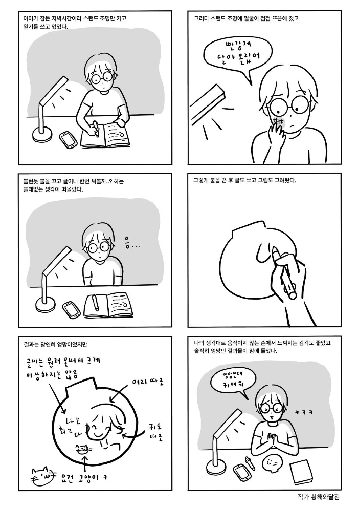 거실 책상에 스탠드의 불빛을 최소로 켜 두고 책을 읽고 일기를 썼다. 그런데 시간이 흐를수록 스탠드 조명에 볼이 뜨끈해져 버렸다. 얼굴에 수분도 쫙 빠진 듯 건조했다. 불빛을 이리저리 조절해 보고 해 보지만 얼굴 쪽은 어쩐지 계속 불편했다. 그래서 그냥 다른 걸 해야겠단 생각에 불을 끄고 아이패드를 켜려던 순간 나는 갑자기 한석봉이 생각이 난 것이다. 아... 왜 이러는 건가.. 싶었다. 하지만 이미 나는 깜깜한 상태에서 눈까지 감고 수첩에 글과 그림을 그리기 시작했다.
