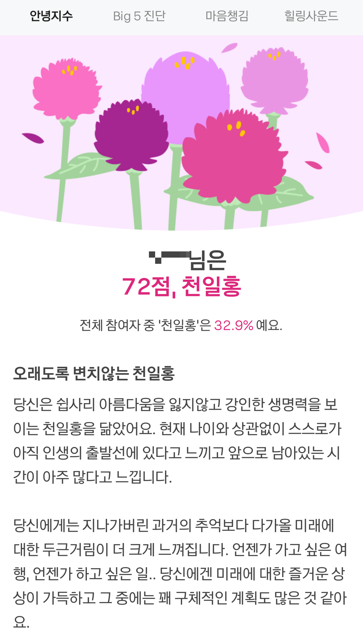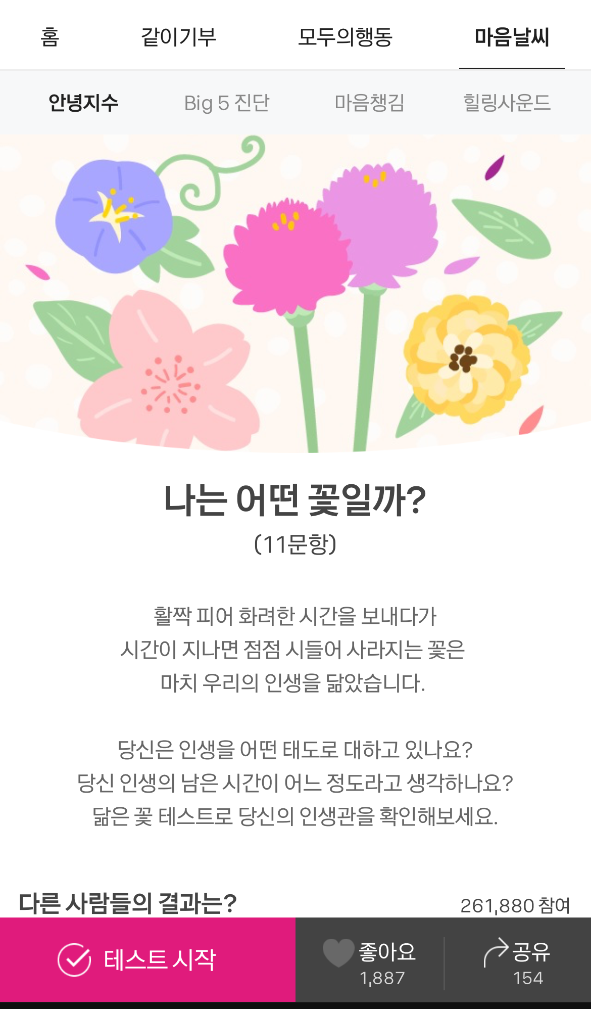 오랜만에 '같이 가치' 마음날씨에 들어가니 흥미로운 심리테스트가 눈에 들어왔다. '나는 어떤 꽃일까?' 식목일이니 내 마음에 꽃을 심는 마음으로 열한 개의 문항에 답해보았다. 올 봄에는 천일홍, 다음에는 어떤 꽃으로 살아볼까. 촉촉한 단비가 내리는 식목일이다.