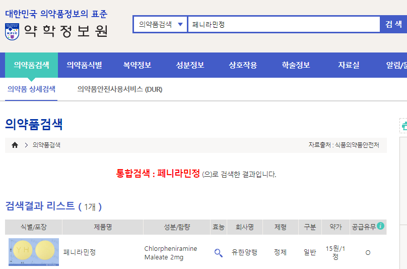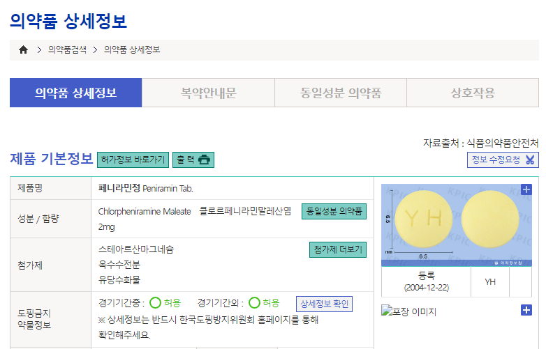 약 봉투에 들어있는 노란색 알약이 ‘페니라민정’이었군요. 검색 결과 리스트에서 제품명인 ‘페니라민정’을 클릭했더니, ‘의약품 상세정보’ 창이 열립니다. 약의 성분, 함량, 첨가제부터 효능과 효과, 용법과 용량, 사용상 주의사항, 복약정보 등 약에 대한 세부 정보가 일목요연하게 정리되어 있어요. 약물 정보는 물론, 복약 안내문을 따로 출력할 수도 있네요.