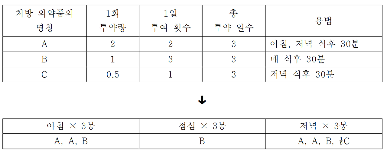 3일간 하루 3번 먹을 약이, 봉투 아홉 개에 나뉘어 담겨 있겠지요. ‘아침’ 봉투에는 A 2알과 B 1알, ‘점심’ 봉투에는 B 1알, ‘저녁’ 봉투에는 A 2알, B 1알과 함께 반으로 쪼갠 C가 담겨 있어야 한답니다.