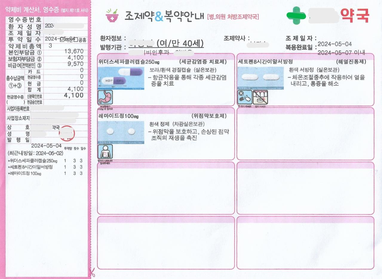 ‘약제비 계산서 ․ 영수증’ 부분은 국민건강보험 요양급여의 기준에 관한 규칙 [별지 제11호 서식]에 정해져 있지만, 약 봉투는 약국마다 다르게 생겼어요. 위의 약 봉투에는 1회 투약량, 1일 투여 횟수, 총 투약 일수, 약 정보, 복용 시 주의사항 등 다양한 정보가 있지만, ‘내복약’이라는 문구와 수령인 이름만 있는 약국 봉투도 있지요.