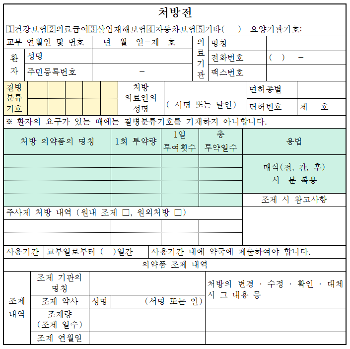 내가 받은 약 봉투에 자세한 정보가 없고, 약국에서 충분한 설명을 듣지 못했다면, 처방된 약에 대한 정보는 어디에서 확인해야 할까요? 바로 '처방전'입니다. 처방전 양식은 의료법 시행규칙 [별지 제10호 서식]으로 정해져 있어요. 처방전에는 환자와 발급한 의료기관에 대한 정보, 질병분류기호, 처방 및 조제 내역 등이 기재됩니다.
