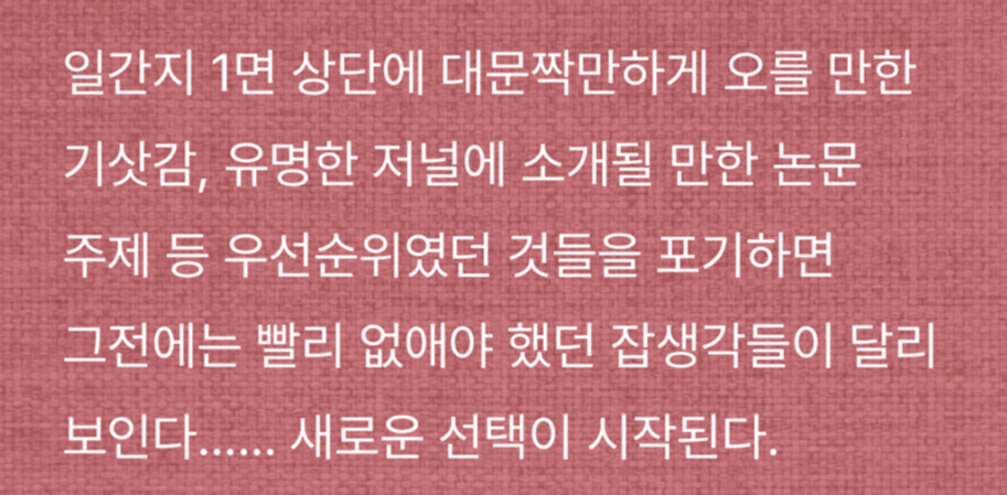 이 대목을 읽으면서, 논문만 남겨두고 학위를 포기했던 때를 떠올렸고, 저자와 조금 다른 결론을 내렸다는 걸 기억해 냈다. 고민 끝에 포기하자, 오랜 체증이 내려간 듯 후련했다. 학위 공부를 시작하고 일과 병행했던 때와, 포기하던 시기의 내 생각과 상황이 달라졌기 때문에, 그 일은 포기했어야 마땅했다. 내 인생의 본질과 멀어진 작은 계획들은, 어쩌면 수단에 불과하고 수정할 수도 있는 거니까, 이런 포기는 선택이라고 불러야 할지도 모르겠다.
