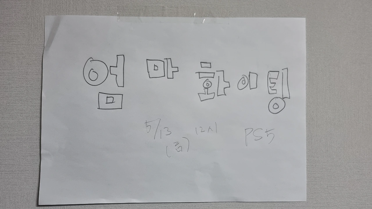 지금도 내 책상 위에 붙어 있는 메모다. 5월 13일은 게임 쇼핑몰에서 플레이스테이션 최신버전 기기를 한정 수량만, 매월 딱 하루, 온라인에 푸는 날이었다. 세일도 아니고, 한정판도 아니고, 그냥 일반 상품인데 수량이 적다는 이유로 판매 개시 후 단 몇 초만에 품절되어 버린다. 이미 다른 사이트에서 2번쯤 실패했기에, 메모로도 부족해 휴대전화 알람까지 맞춰놨고, 출근하는 남편에게 장난감 먼저 주문해 놓고 점심을 먹으라고 신신당부를 했다. 실은, 4시간 거리 지방에 사는 동생에게도 도움을 요청하여, 세 명의 어른이 11시 55분부터 온라인 줄서기를 했던 것이다.