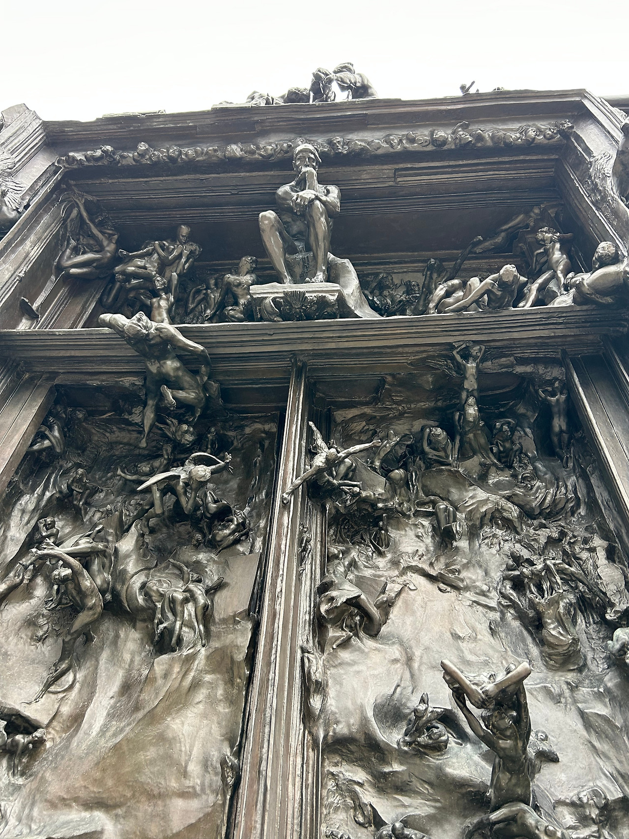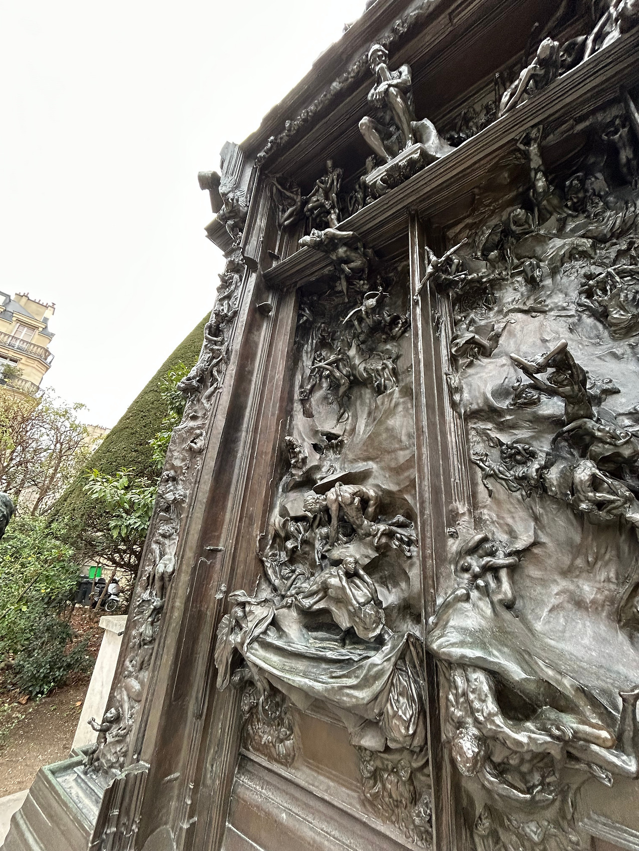 서울의 실내 전시관에서 봤던 '지옥의 문' 쌍둥이 형이 찬바람을 맞으며 야외에 우뚝 서 있었다. 비수기임에도 사진 찍는 사람들이 끊이지 않았다. 사람이 없는 틈을 타서 작품을 뜯어봤다. 움직이고 흐르는 이야기, 그것도 난해하고 긴 글을, 멈춰 있는 그림이나 조각으로 한 화면에 담는 것이 쉬울 리 없었다. 로댕은 단테의 신곡을 수없이 읽고 상상하고, 조각을 더하고 떼어내다가 청동문을 완성하지 못하고 운명했단다. 실제 청동문이 주조된 것은 로댕이 죽은 뒤였다.
