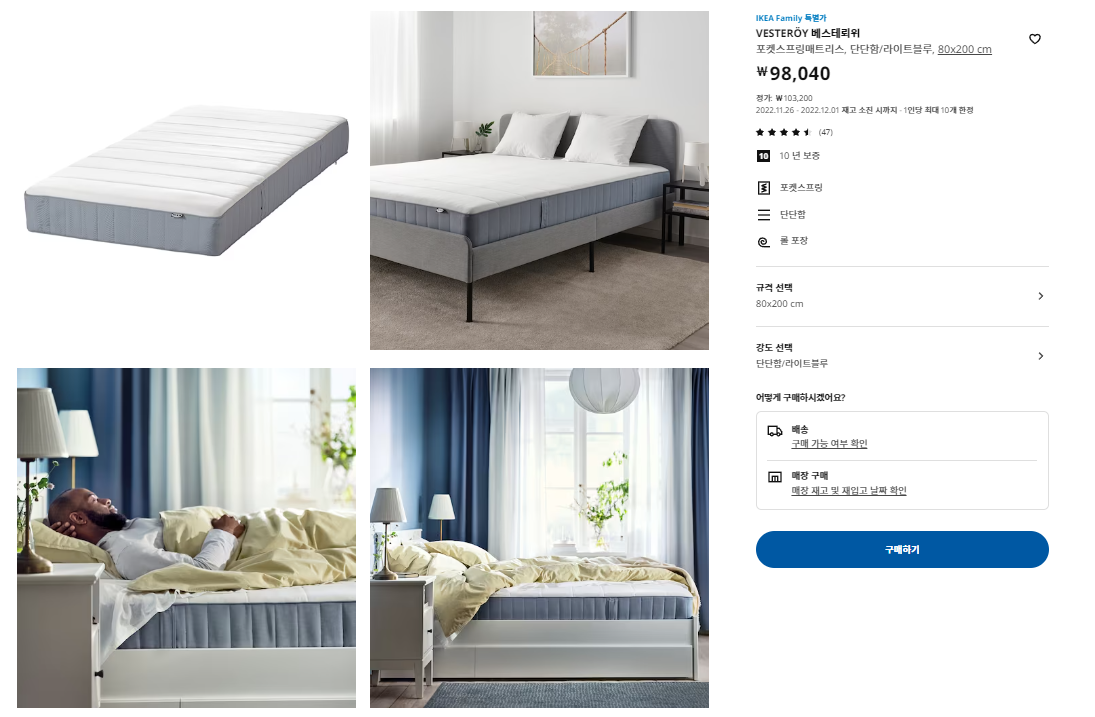가구가 갖추어진(Furnished) 집은 월세가 100만 원가량 비쌌어요. 1년 치 비용을 계산해 보니 1,200만 원. 현지에서 가구를 대여해도 800만 원이면 침대, 식탁, 책상, 의자, 소파 정도는 빌리겠더라고요. 볼 것도 없이 텅 빈(Unfurnished) 집을 선택했어요. 이 참에 '아이키아(IKEA)' 가구를 써 봐야겠다, 들뜬 마음으로요. 제가 쇼핑 좋아하잖아요. 이케아 홈페이지에 들어가 보니 아직도 제가 샀던 물건들이 있네요. 1년 쓸 거니까 가장 싼 걸로, 침대는 프레임 없이 매트리스만 깔자. 대충 살다가 헐값에 중고로 팔고 가자. 가구에 쓸 돈으로 여행을 한 번이라도 더 가자. 이런 마음으로 산 것들이랍니다. 한 번 보세요.