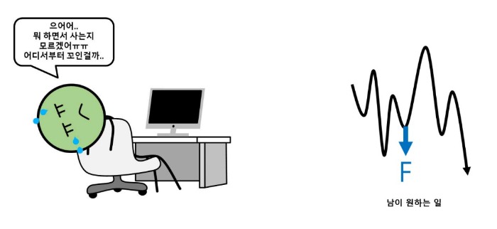 남이 원하는 인생을 살면 인생 곡선이 계속해서 아래 방향으로 힘을 받습니다. 푹 자고 나서 충전된 체력으로 열심히 일해도, 일과가 끝날 땐 무기력함만 남습니다. 내가 선택하지 않은 일에 온 힘을 쏟았기 때문입니다.
