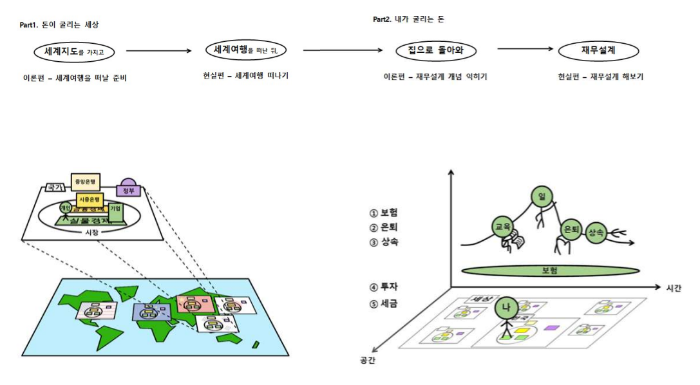 두 번째 단계(내가 사는 세상 2권 : 내가 굴리는 돈)는 돈을 잘 쓰는 것입니다. 투자를 잘해서 돈을 잘 불리는 것만큼 돈이 빠져나가는 곳을 정확히 예상하는 것도 중요합니다. 방에 차분하게 앉아 보험, 결혼자금, 은퇴계획 등 ‘나의 인생에서 돈이 큼직큼직하게 쓰이는 곳’을 살펴보고, 적절한 계획을 짜는 방법을 배웁니다. 내가 굴리는 돈 – 이론편에서는 재무설계 개념을 배운다고 생각하시면 됩니다.