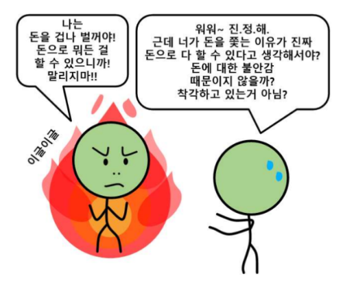 아닙니다. 불안감 때문입니다. 마음속을 깊이 들여다봅시다. 사람들은 대부분 돈 때문에 비참해지는 것을 피하고 싶어 하지, 돈으로 권력을 얻거나 갑질을 하고 싶어 하진 않습니다. 우리는 ‘돈에 대한 불안감’을 ‘돈 그 자체에 대한 욕구’로 착각하면서 살아갑니다.