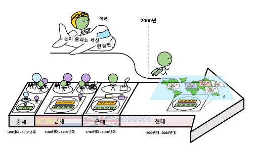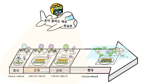 그리곤 비행기에서 착륙해서 오늘날(2000년대)의 각국을 관광하면 돈, 경제적 관점에서 어떤 일이 있었는지 살펴봅니다. 우리들의 여행순서는 ‘일본 → 유럽 → 중국 → 미국 → 한국’ 순입니다.